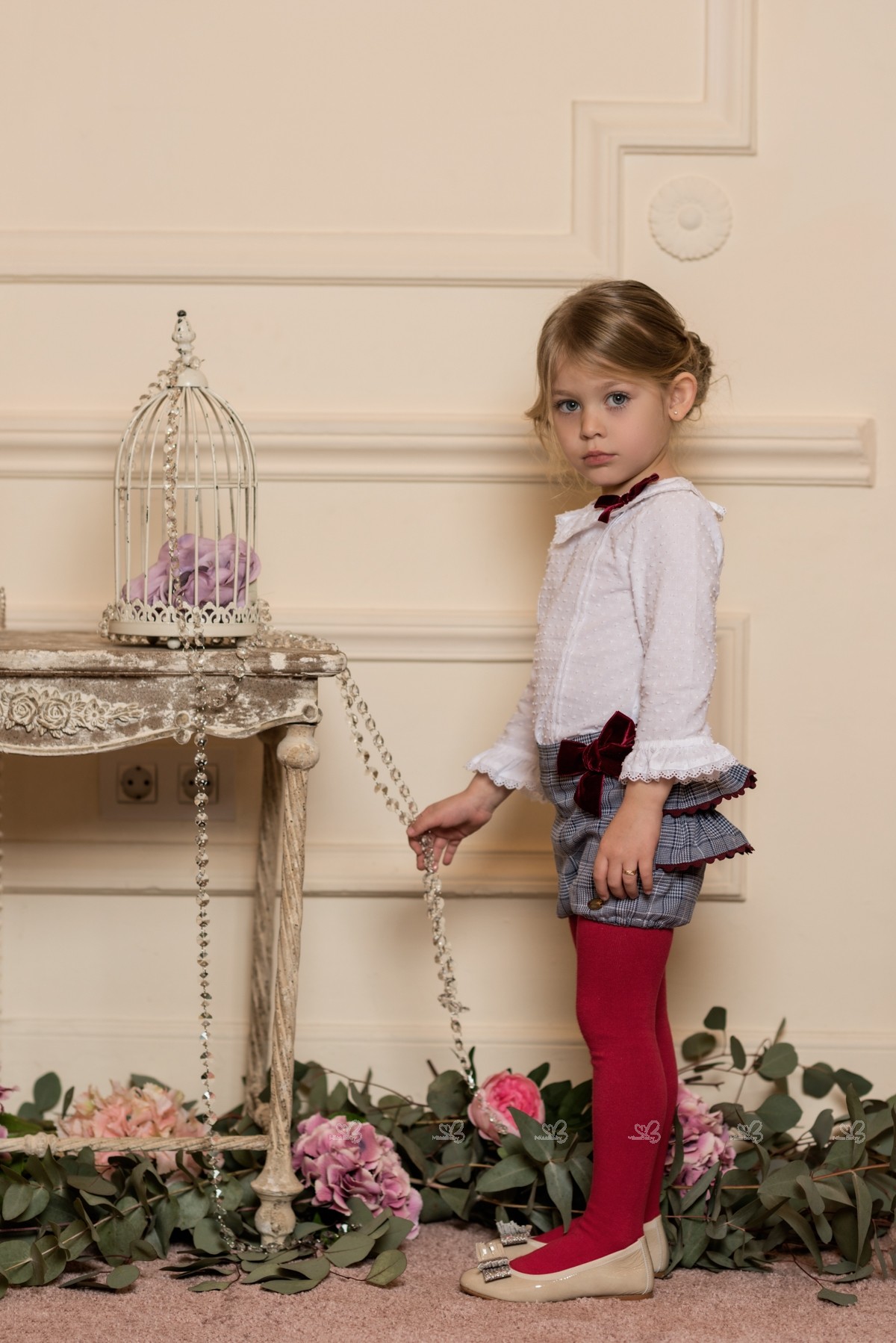 Dolce Petit Colección Otoño-Invierno 2018/19. Conjunto compuesto por jersey punto granate, blusa plumeti blanca con mangas y cuello de volante terminado en puntilla al tono adornado de lazo de terciopelo granate, y bombacho a Principe de Gales marino con volantes rematados en lazo de ondas granate y lazo en cintura de terciopelo. Cierre en espalda con botones y cintura ajustable.