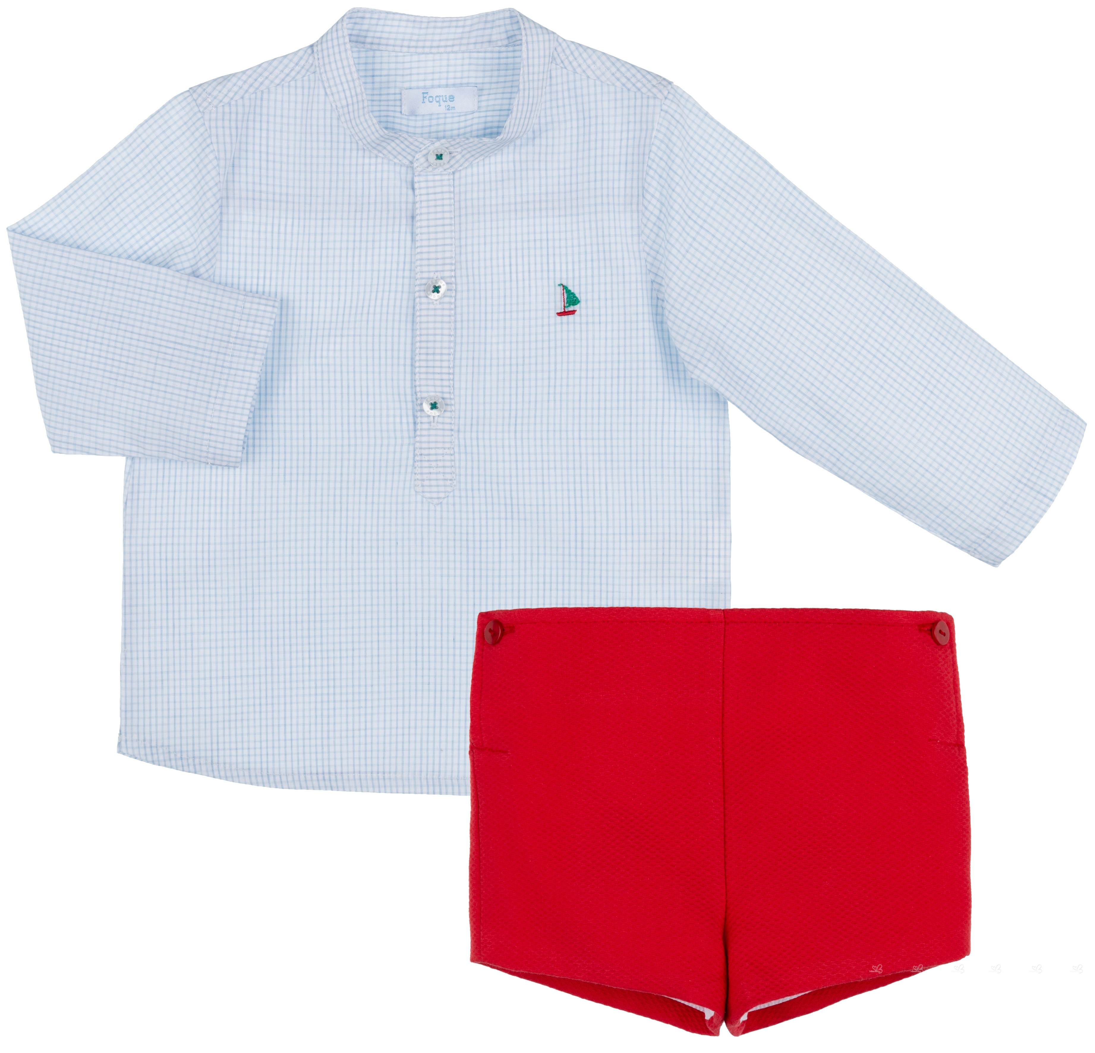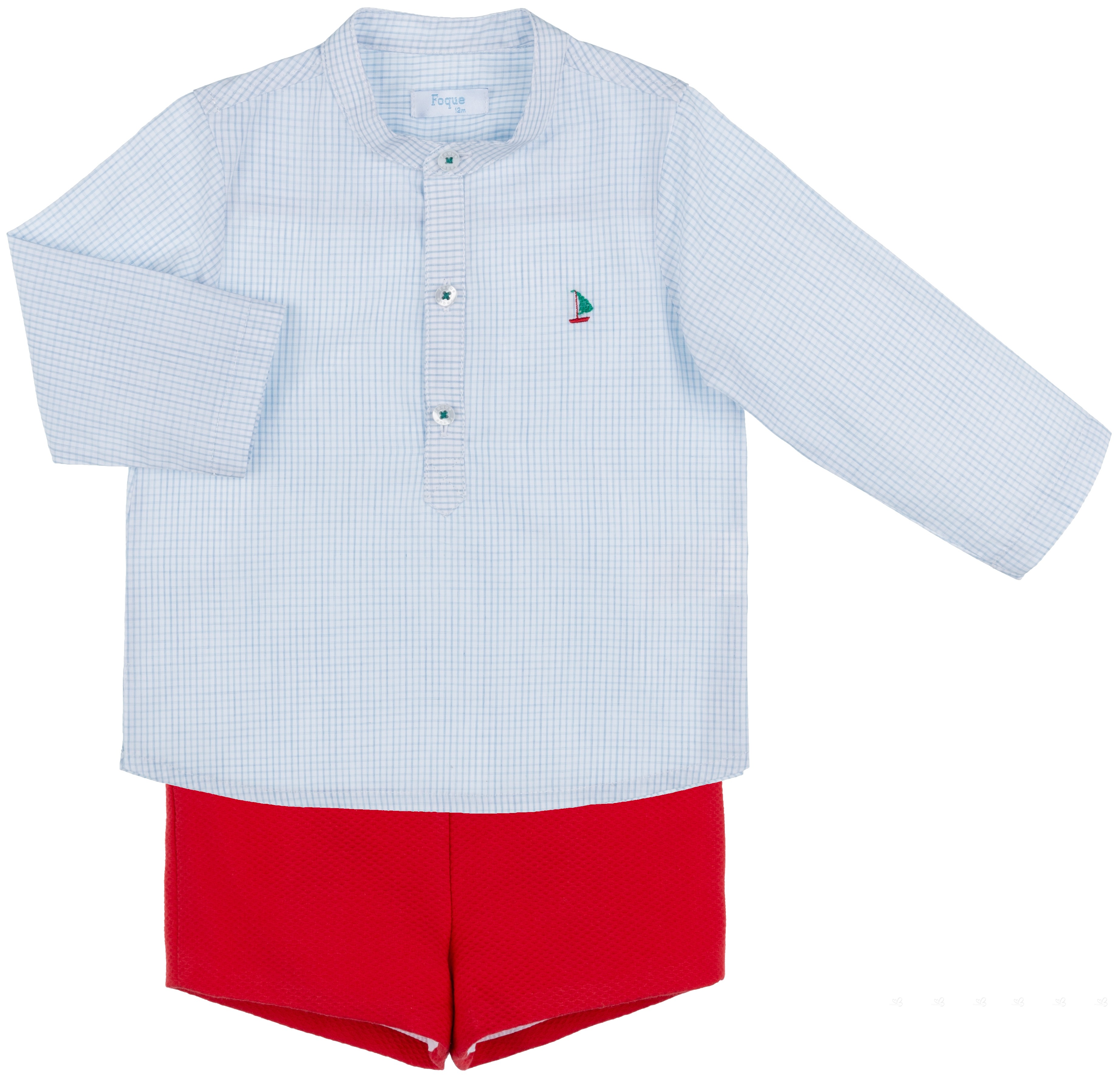Foque Colección Primavera-Verano 2019. Conjunto de niño formado por camisa de manga larga de cuadros azul con cuello mao y detalle de barco velero bordado en pecho. Abrocha por delante con tres botones. Pantalón corto piqué rojo, con dos bolsillos delanteros y dos botones en cintura. Cintura ajustable y forro interior.