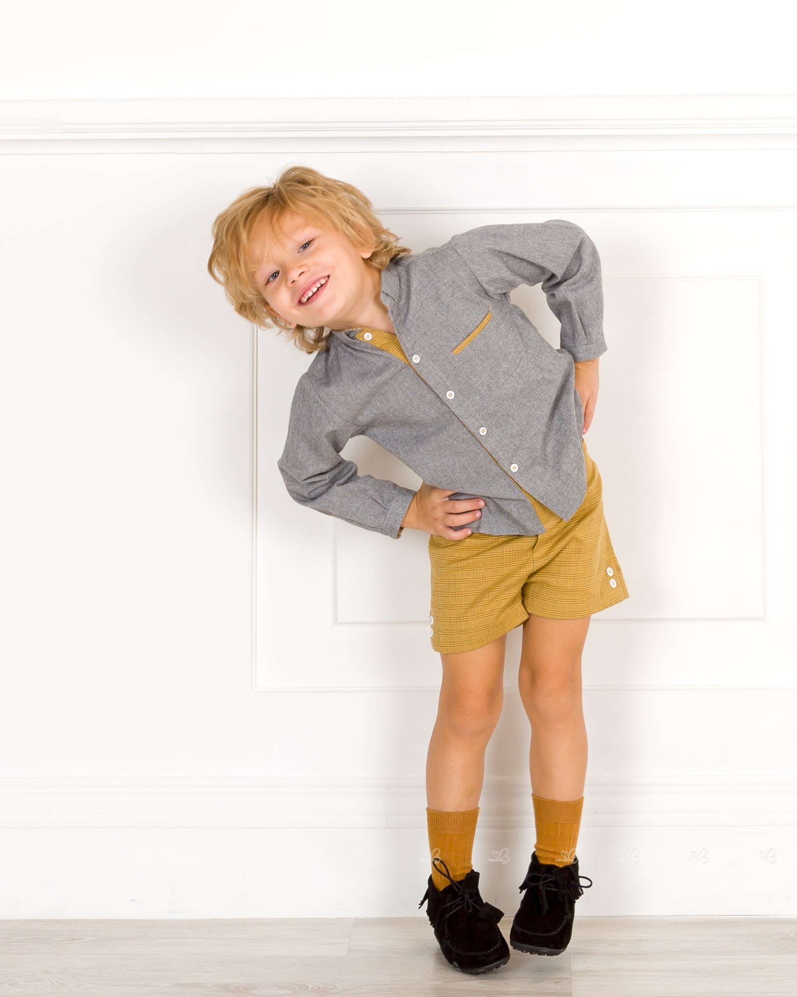 José Varón Colección Otoño-Invierno 2018/19. Conjunto de niño compuesto por camisa en color gris, con filo mostaza en bolsillo y manga. Short Princípe de Gales en color mostaza con botones laterales, cintura engomada y forro interior.
