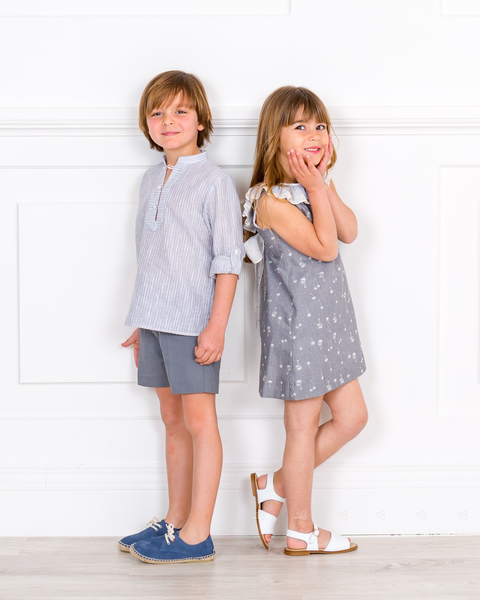 Ancar Colección Primavera-Verano 2018. Conjunto niño camisa cuello mao a rayas gris y blanco, manga larga con tira para remangar y fijar. Abrocha con botones delante. Short a juego en algodón gris. Con dos bolsillos delante, trabillas y forro interior.