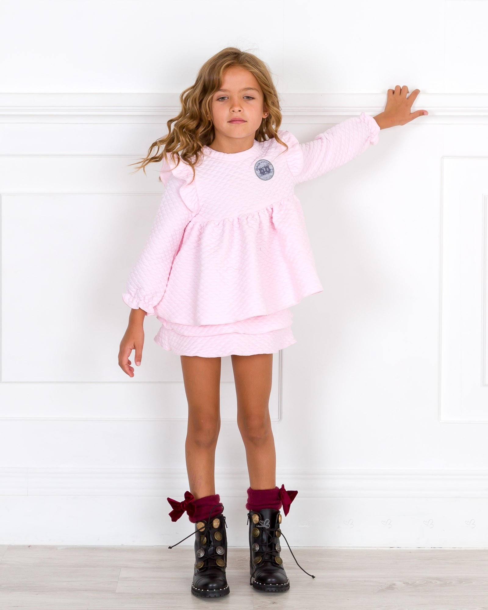 Badum Badero Colección Otoño-Invierno 2018/19. Conjunto de niña colección Loli-Pop compuesto por sudadera y fshort alda de volantes en color rosa con la cintura elástica en lurex plata.