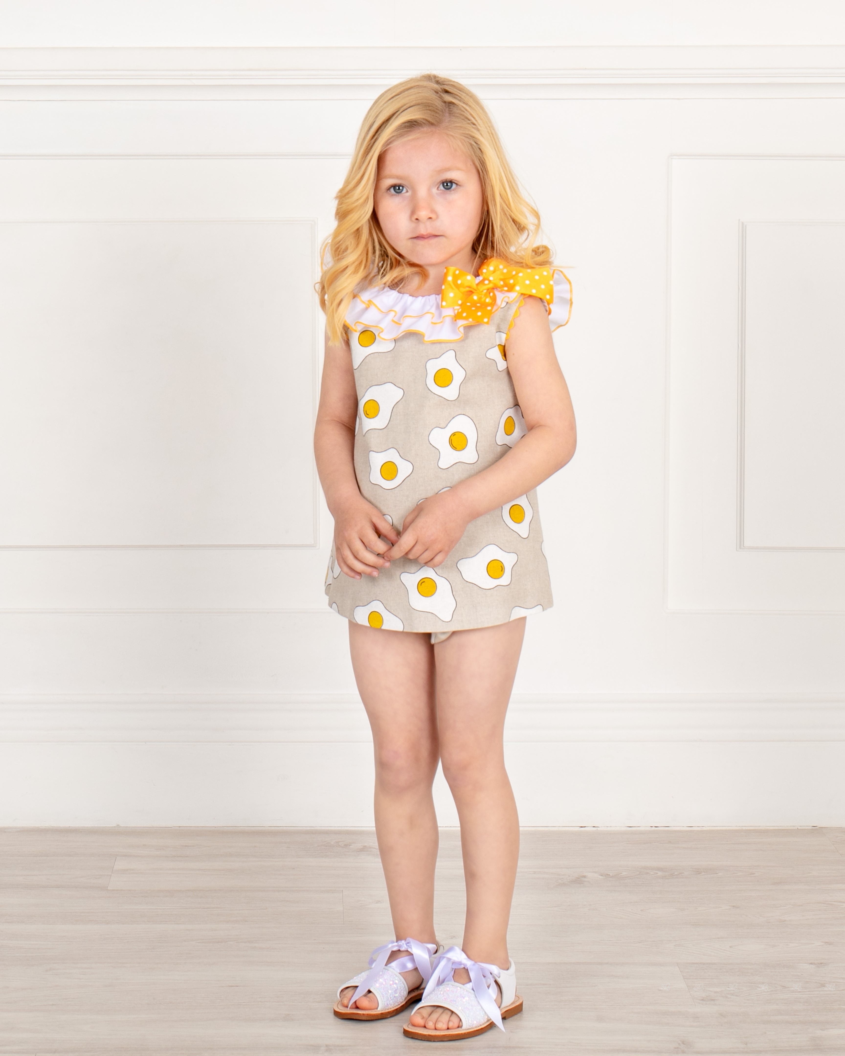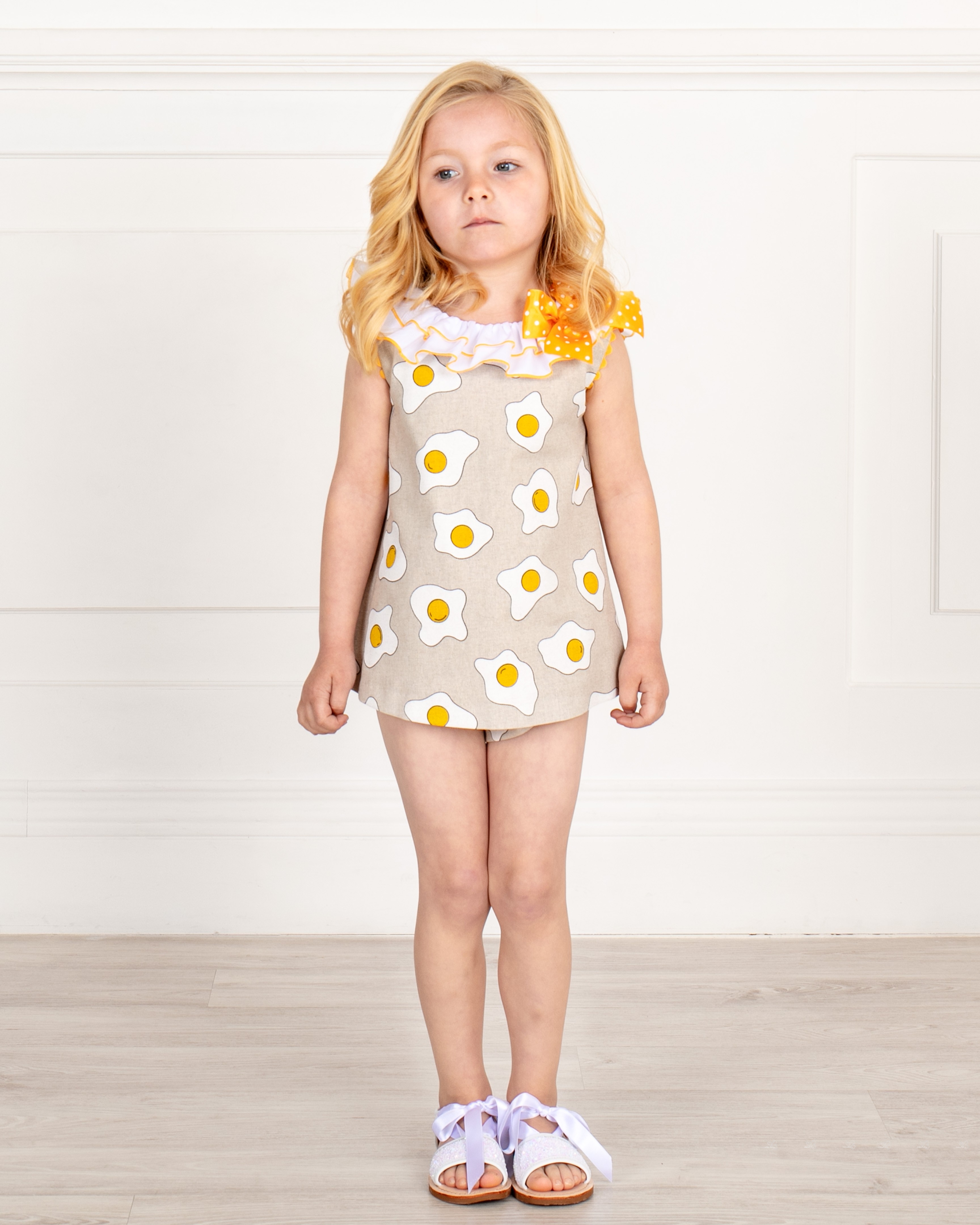 Nini Moda Infantil Colección Primavera-Verano 2019. Jesusito para niña compuesto por vestido de corte evasé beige con estampado de huevos fritos y cuello bardot con doble volante blanco bordado con hilo amarillo y decorado con un lazo amarillo con lunares blancos y braguita beige con el mismo estampado. Cierre con cremallera trasera y forro interior.