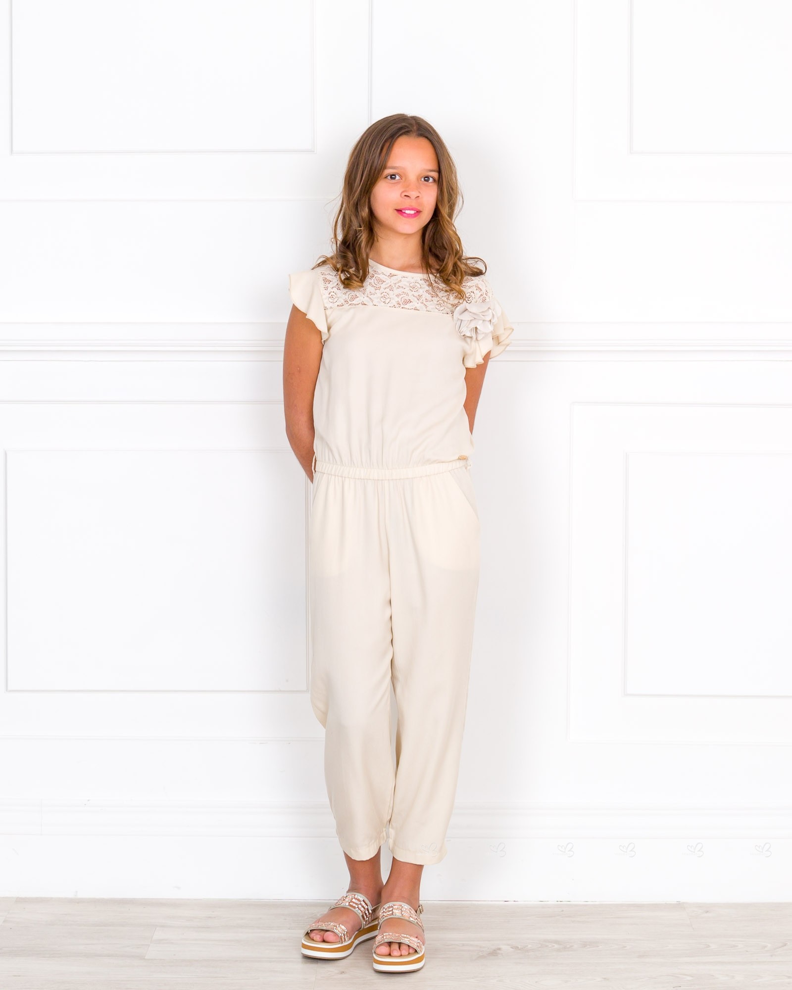 Meilisa Bai Colección Primavera-Verano 2018. Mono largo volante en manga, broche flor plumeti con precioso cuello y espalda en guipur beige. Cierre en espalda con botón, cintura y pernera engomada con bolsillos laterales.