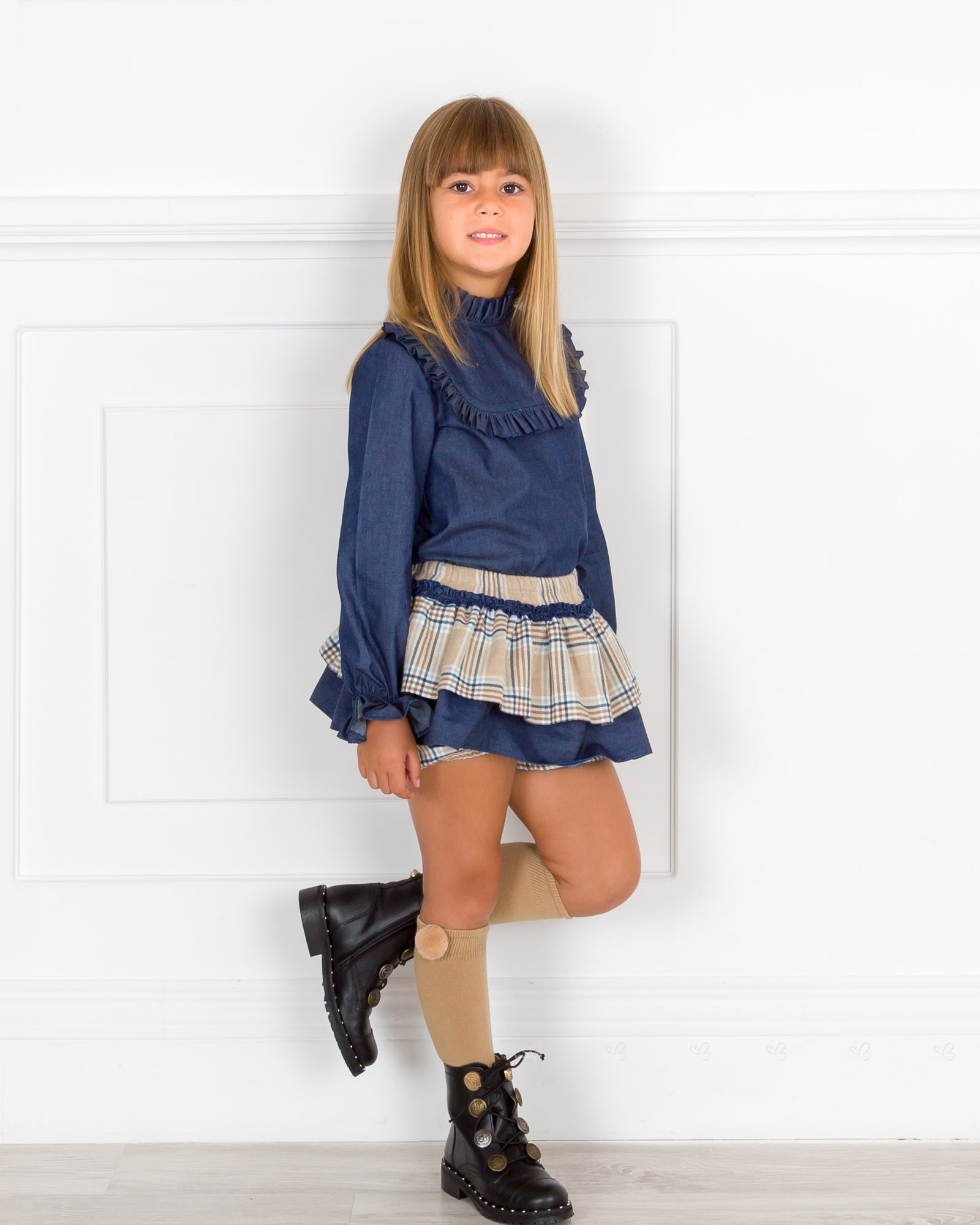 Outfit Niña Conjunto Blusa Denim & Falda-Short Cuadros Beige & Abrigo Punto Beige