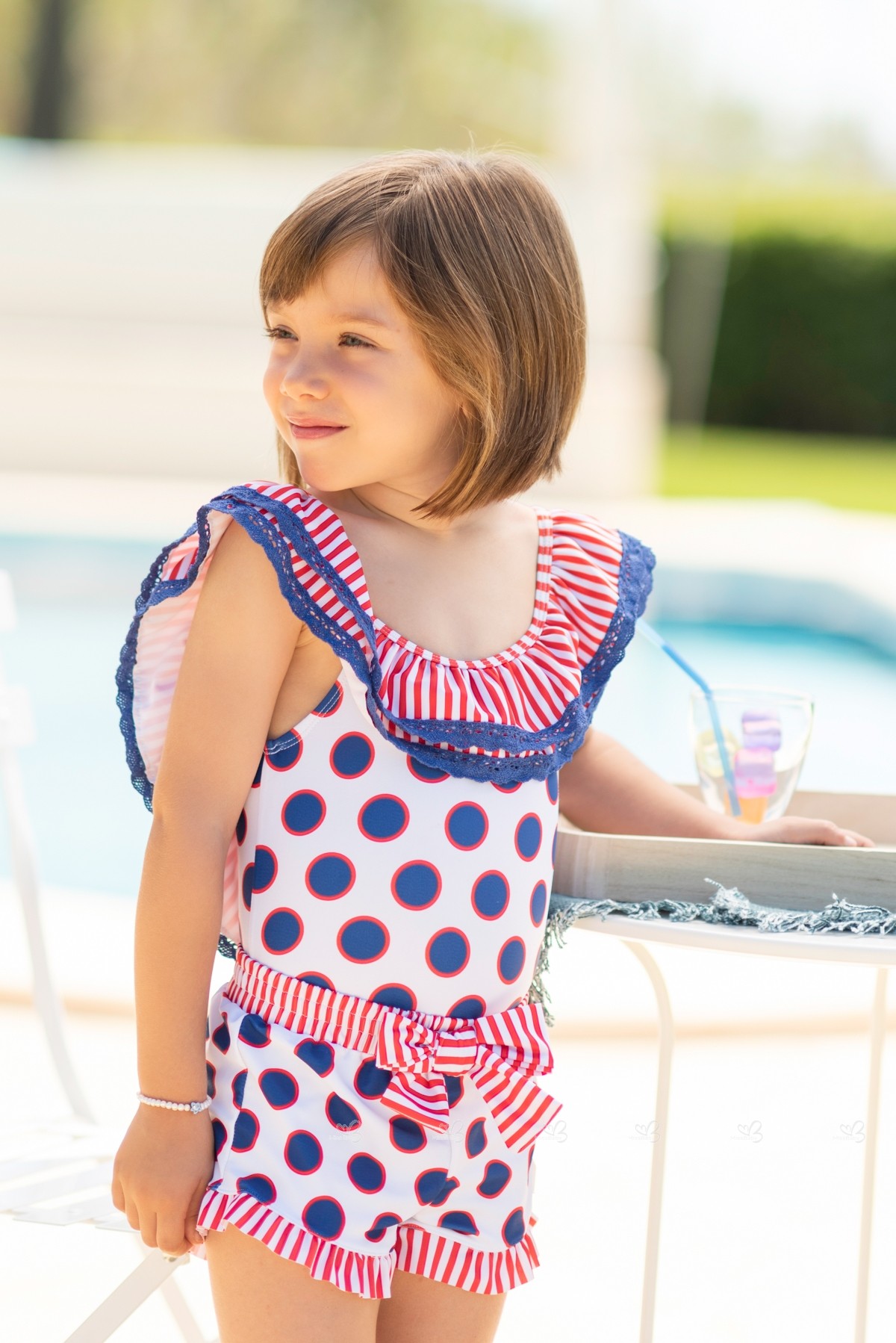 Short Baño Niña Lunares Marino & Rojo con Volante Rayas Rojas