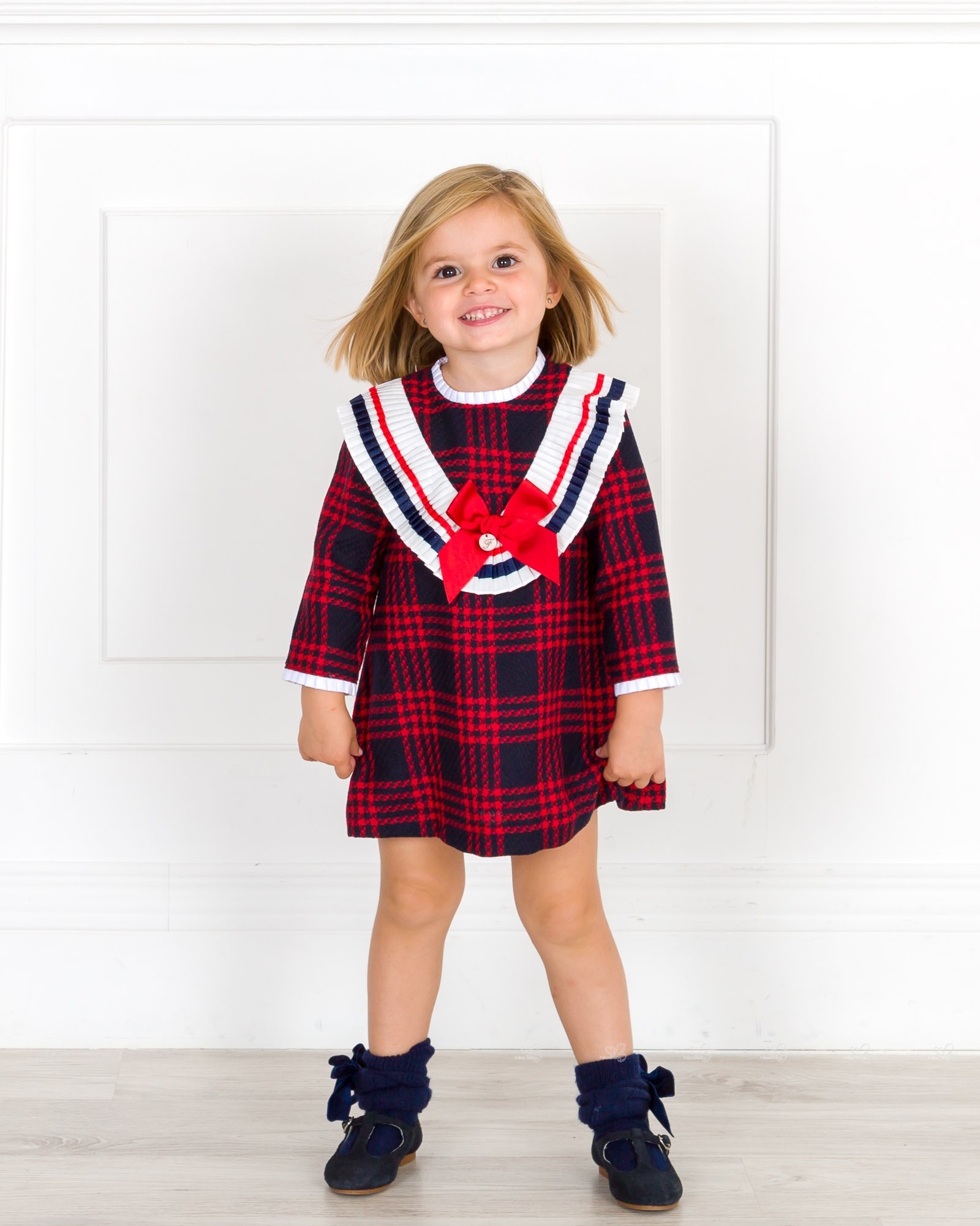 Foque Colección Otoño-Invierno 2018/19. Vestido College cuadros rojo y marino, con volante tableado estilo marinero, adornado con lazo rojo central. Cierre en espalda con cremallera invisible y forro.