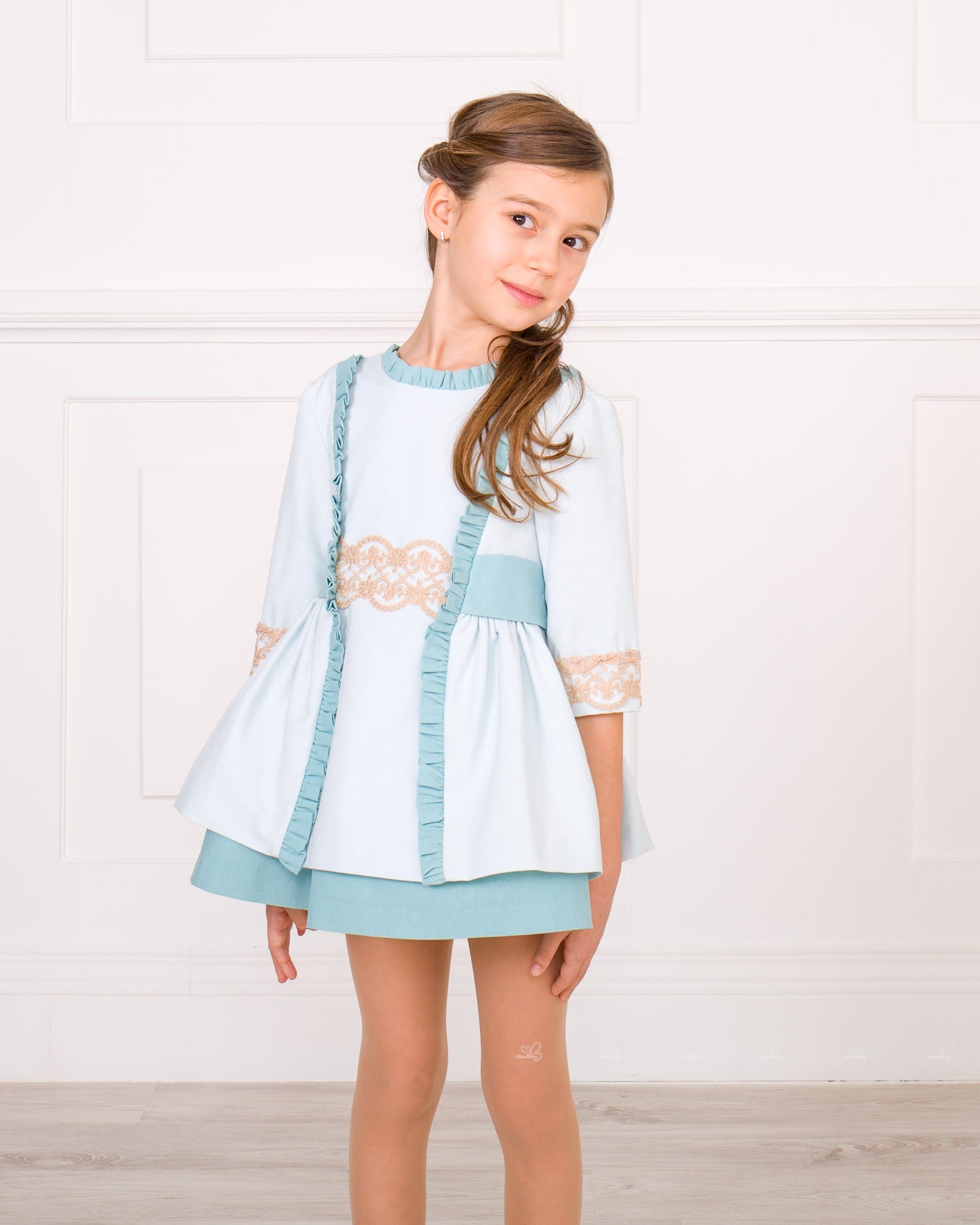 Vestido Niña Manga Francesa Verde & Encaje Beige