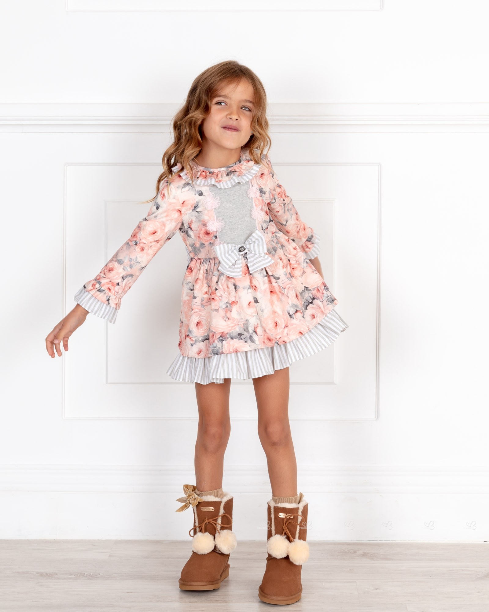 Dolce Petit Colección Otoño-Invierno 2018/19. Vestido de niña estampado floral en color salmón con volante fruncido en cuello, bajo mangas-vestido a rayas gris y adornado de flores de lana rosa en pecho y lazada en espalda. Cierre en espalda con botones y forro.
