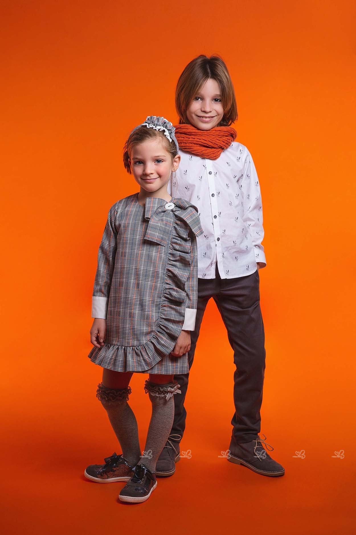 Rochy Colección Otoño-Invierno 2019/20. Vestido para niña de corte evasé estampado con cuadros príncipe de gales en gris, negro, azul francia y melocotón con volantito delante desde el hombro hasta el bajo. Detalle de lazada en cuello adornada con un botón. Puños blancos tipo camisa con doble botonadura. Cierre en espalda con cremallera. Forro interior.