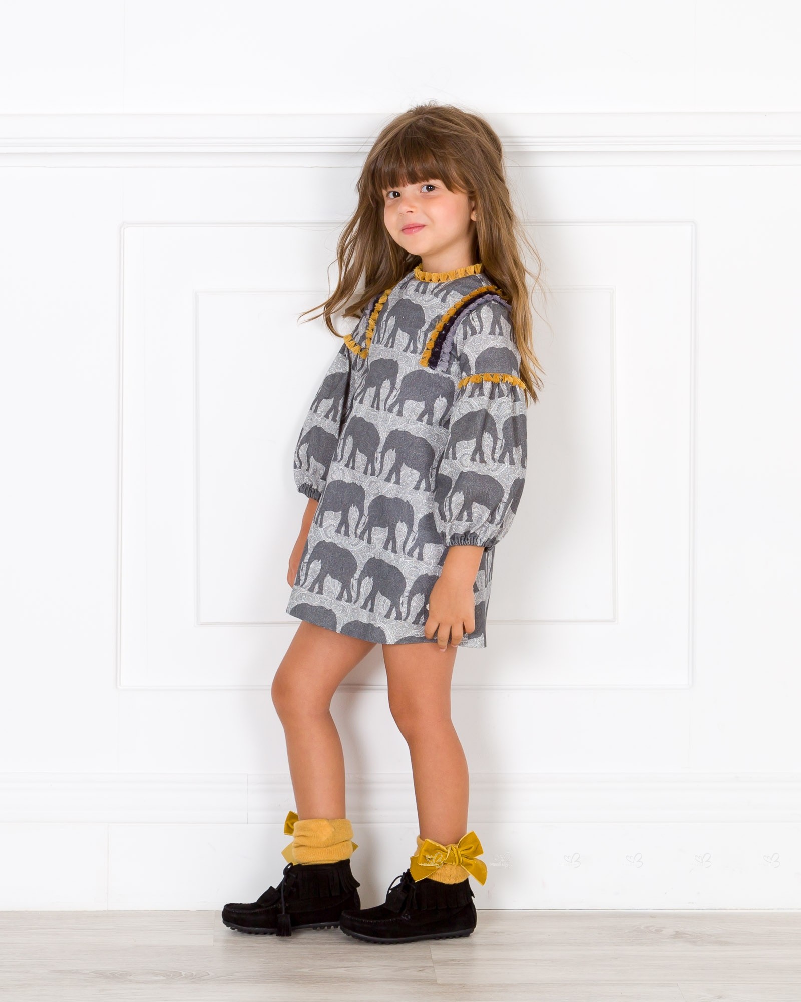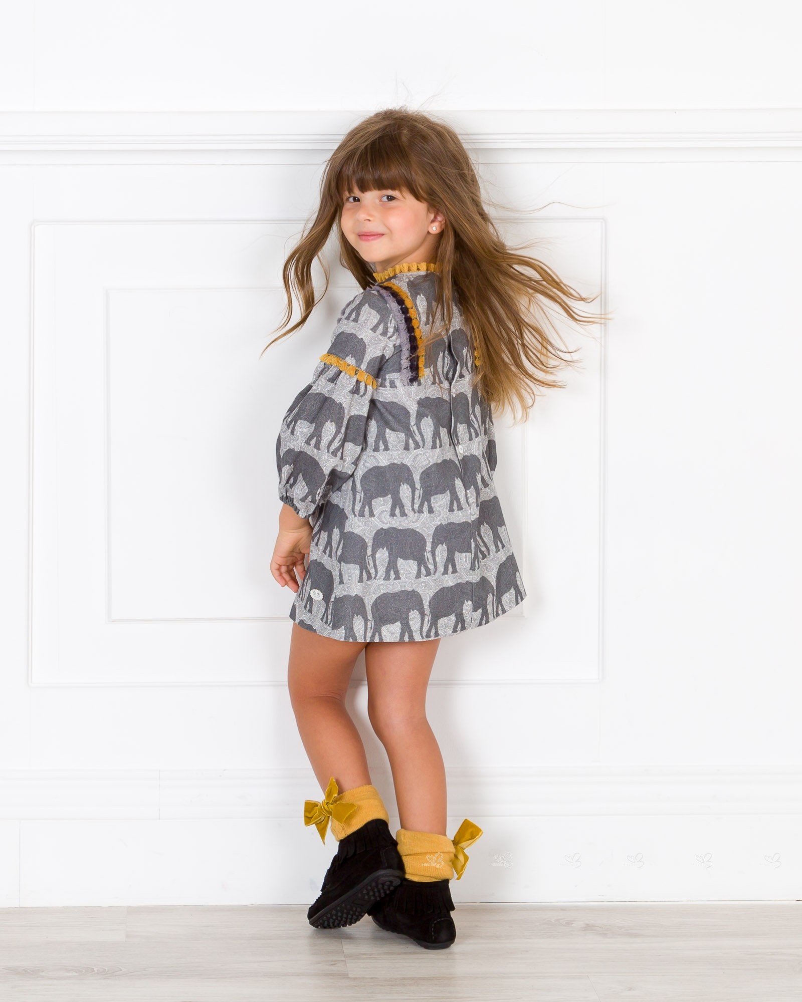 Vestido Niña Evasé Elefantes Gris & Borlas Mostaza