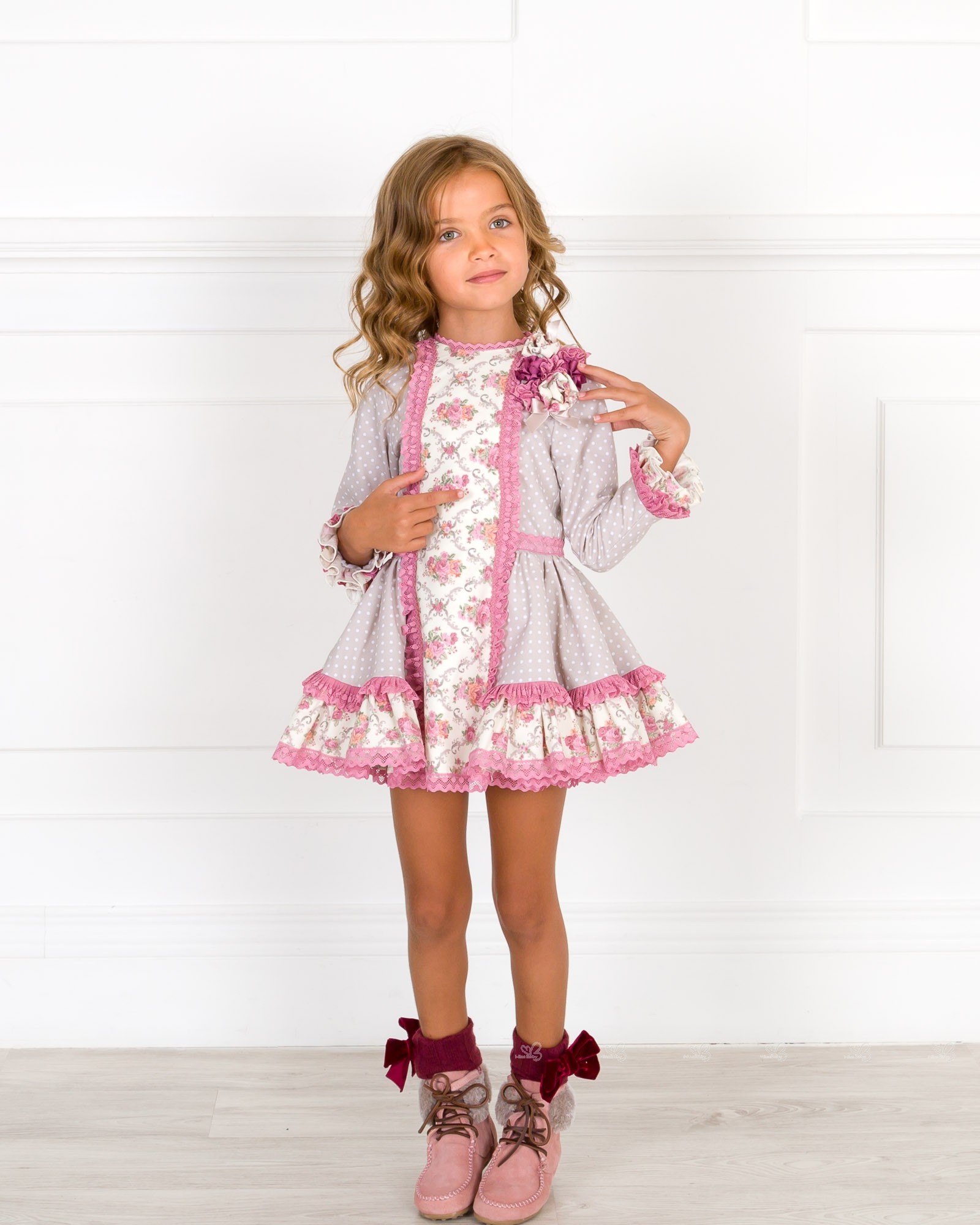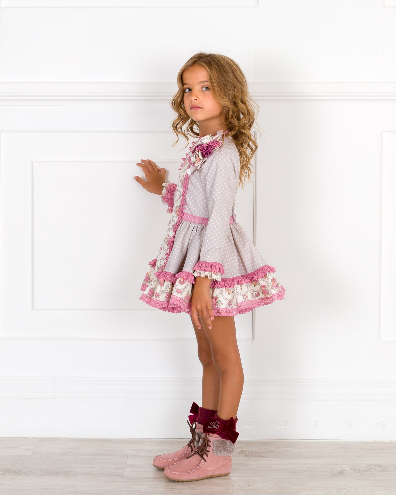 Nini Moda Infantil Colección Otoño-Invierno 2018/19. Vestido niña estampado a topitos y flores en tonalidades de rosa rematado con encaje en volantes y pecho. Broche de flor en diferentes tejidos en lateral pecho. Cierre en espalda con botones y forro interior.