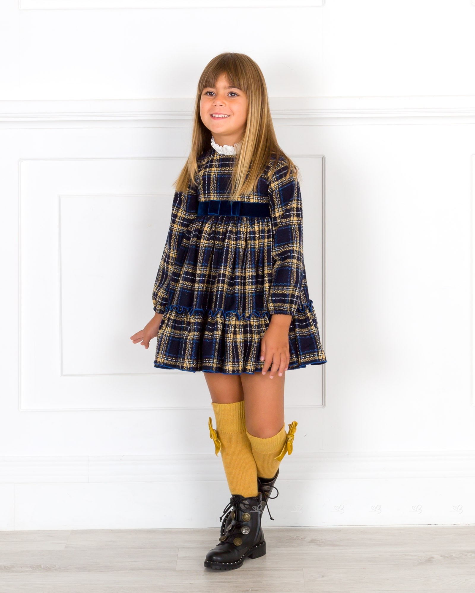 Eva Castro Colección Otoño-Invierno 2018/19. Vestido de niña de la Colección Leonor en tweed a cuadros marino y mostaza, con cuello farol blanco, volante en bajo y lazo de terciopelo marino en cintura. Cierre con cremallera en espalda y forro interior.