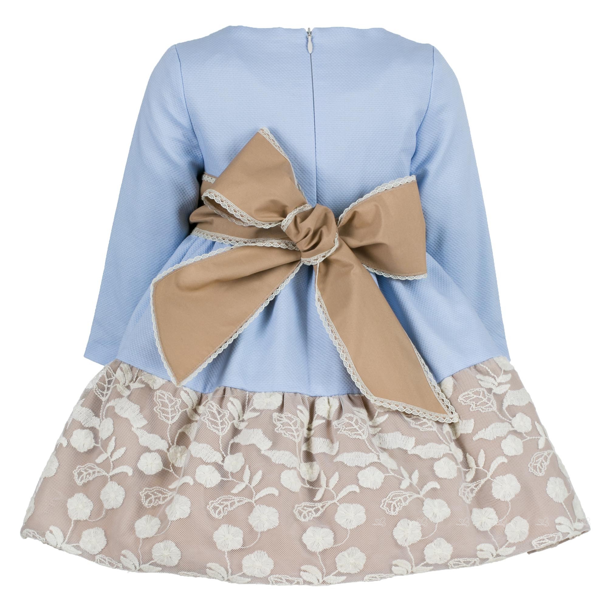 Como un paseo por la nubes! Este vestido hará brillar a la princesa de la casa. En favorecedor pique de algodón celeste, con falda de gran vuelo y bajo en tostado con tul bordado en calidad mousse. Gran lazada en la espalda. Manga francesa, cierre con cremallera y forro interior.