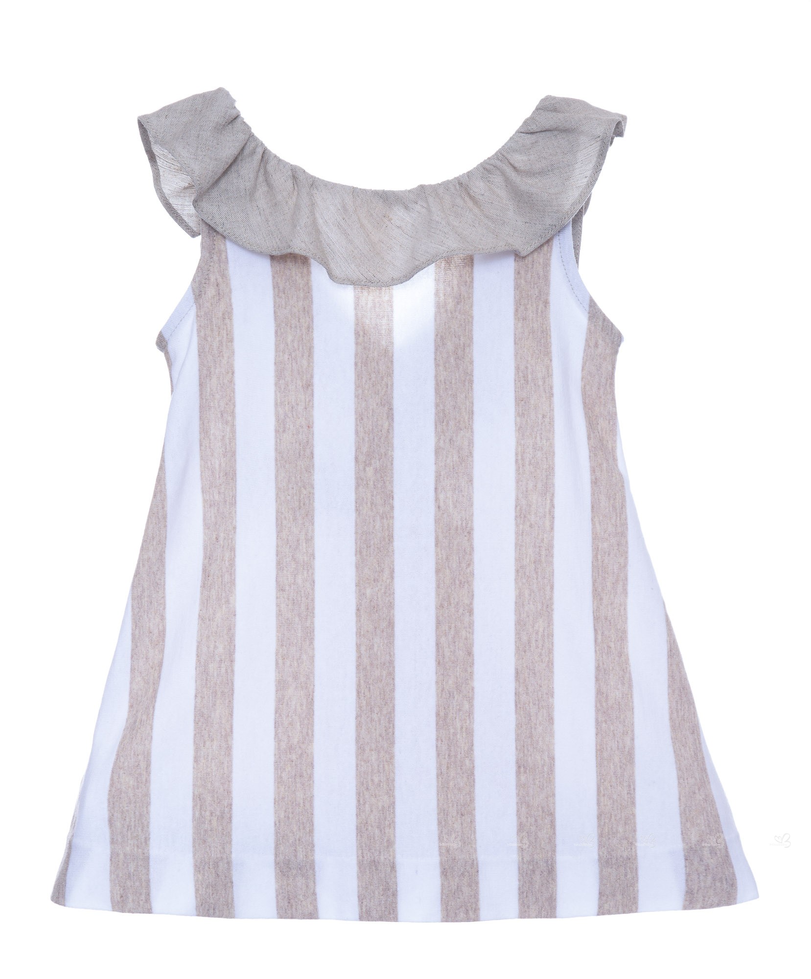 Este vestido de punto de algodón a rayas blancas y beige es una propuesta muy ponible de Ancar Primaver Verano 2015. Corte evasé con escote en la espada adornado de volante de lino y lazada.Perfecto para llevar a diario.